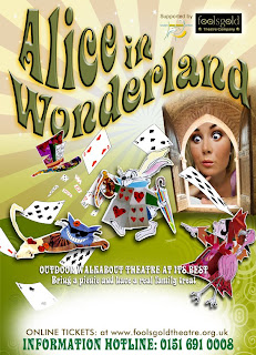 Billed as “outdoor walkabout theatre,” Foolsgold is currently playing at the Williamson Tunnels in Liverpool, so the audience actually travels underground along with Alice! See the Foolsgold website for other engagements.