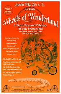 Wheels of Wonderland is an interactive theatrical spectacle—a production of Alice in Wonderland performed entirely on bicycles—celebrating human-powered magic of all shapes and sizes. Featuring the Austin Bike Zoo, a variety of Austin, Texas-based performers and many creative cycling characters, this free event takes place May 2, 3, 9, and 10 in various Austin parks.